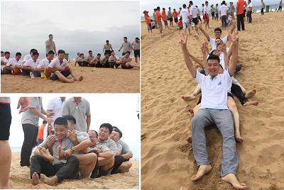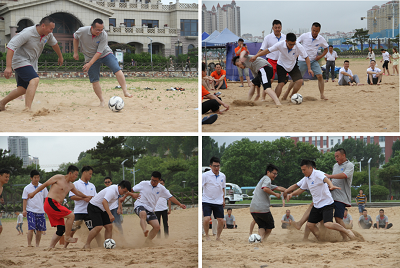 通過(guò)前面三個(gè)緊張的比賽之后,決出了四個(gè)隊(duì)伍進(jìn)行終極項(xiàng)目—沙灘足球比賽。比賽中我們?nèi)w成員手拉手圍出了一個(gè)足球場(chǎng),大家既是邊界,又是觀眾,參與感非常強(qiáng)。每一次斷球,都有搶奪競(jìng)爭(zhēng)對(duì)手客戶時(shí)的喜悅;每一次傳球,都是團(tuán)隊(duì)隊(duì)員相互之間的信任;每一次帶球奔馳,都像手握項(xiàng)目漏斗有底氣;最后的臨門一腳,像揮灑汗水拿到了訂單,充滿了愉悅。看著大家在金沙上努力拼搏的樣子,我們激情高漲,抬頭看了看海的遠(yuǎn)方,心中充滿了愛(ài)與喜悅。