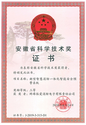 2020年629日上午,安徽省科學(xué)技術(shù)獎勵大會在合肥隆重召開。由依愛消防研制的“新型智慧消防一體化智能安全預(yù)警系統(tǒng)”項(xiàng)目獲得安徽省科技進(jìn)步三等獎。