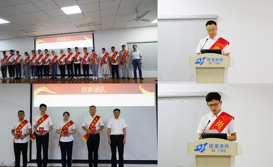 會議伊始,依愛消防黨總支黃薛梅書記宣讀公司2023年上半年創(chuàng)新團(tuán)隊及崗位標(biāo)兵稱號授予決定,史紅旗董事長為崗位標(biāo)兵頒發(fā)榮譽證書并合影留念,許建華所長為創(chuàng)新團(tuán)隊頒發(fā)榮譽證書并合影留念。崗位標(biāo)兵代表李澤旺、胡明宇做交流發(fā)言。